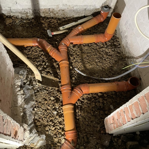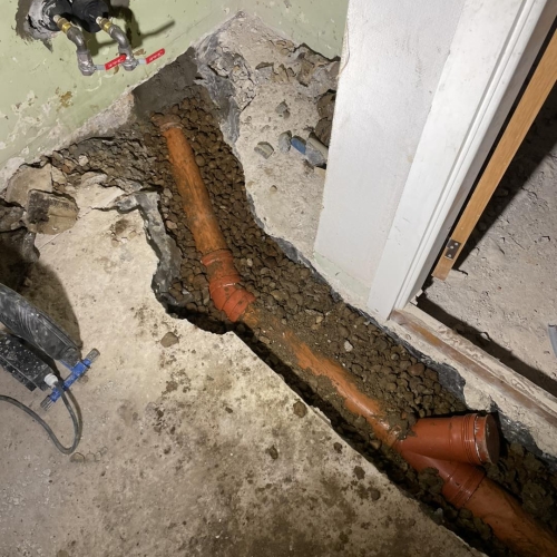 Kunden skulle have renoveret kælderen så han ønskede at vi skiftede det indvendige kloak inden han lukkede gulvet samt lavede nyt spildevand udenfor